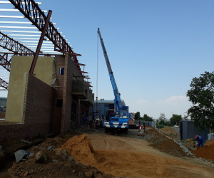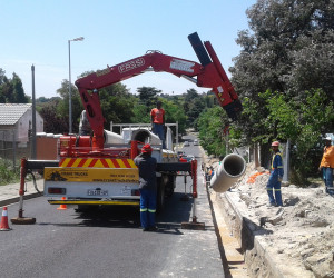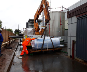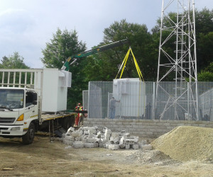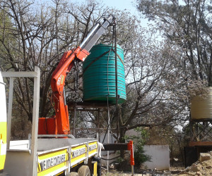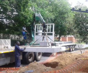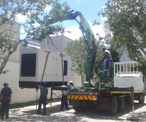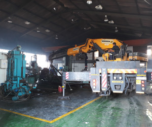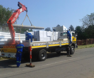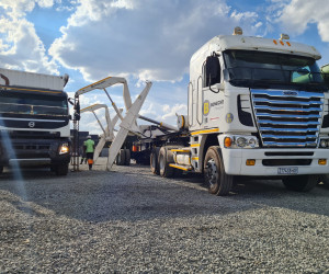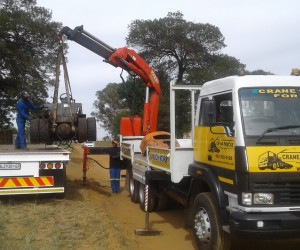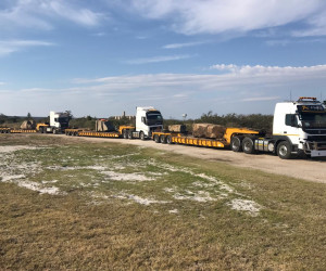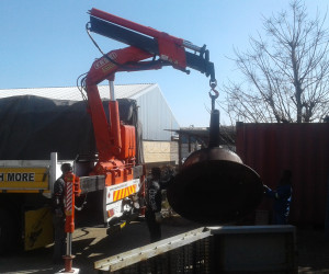 Benecke Transport trucks being off loaded with containers by crane trucks